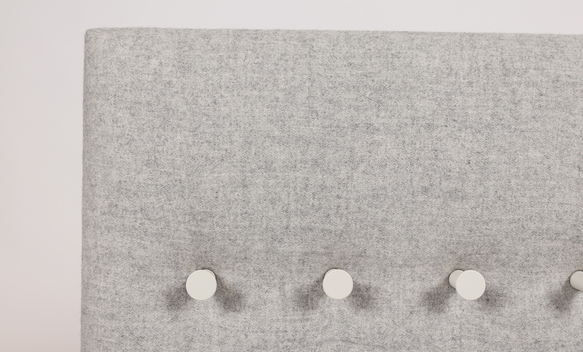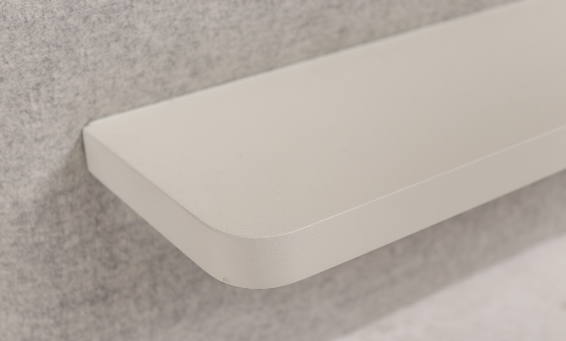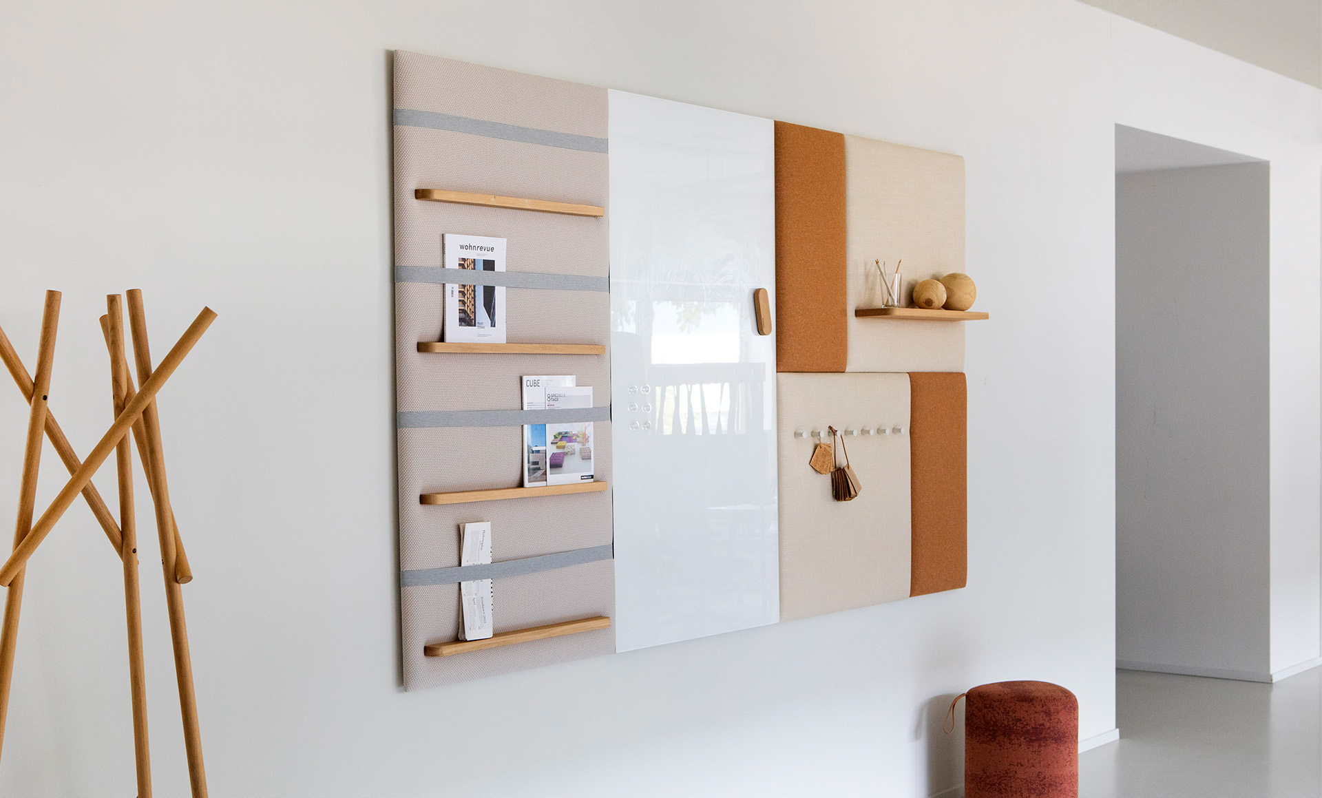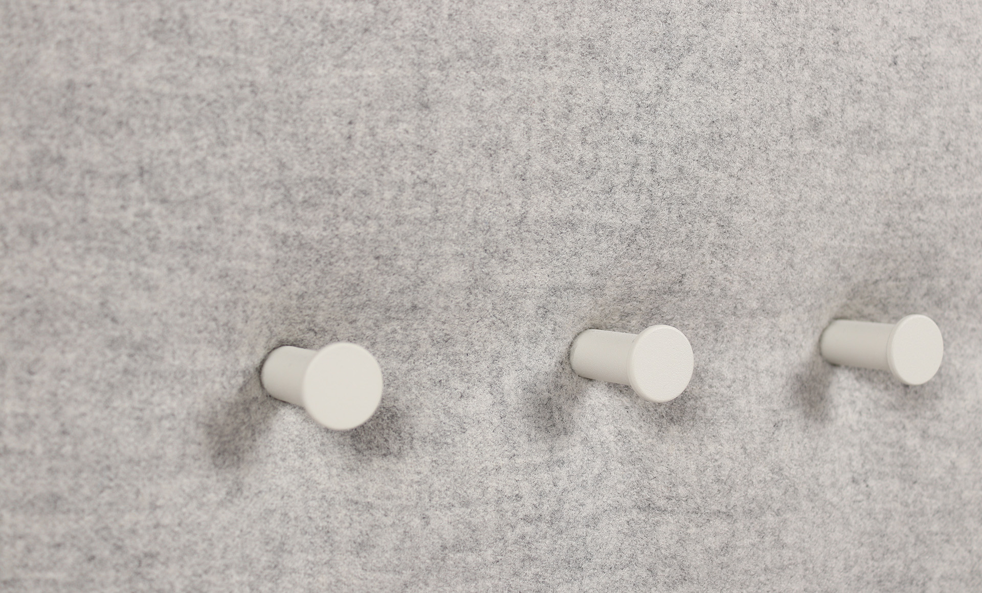 A feature piece yet functional in the office or education space is the Pillow Grid wall panel. This configuration comprises a range of hooks on a wall mounted panel in a grey fabric. Added functionality to the panel is a shelf for displaying small objects.