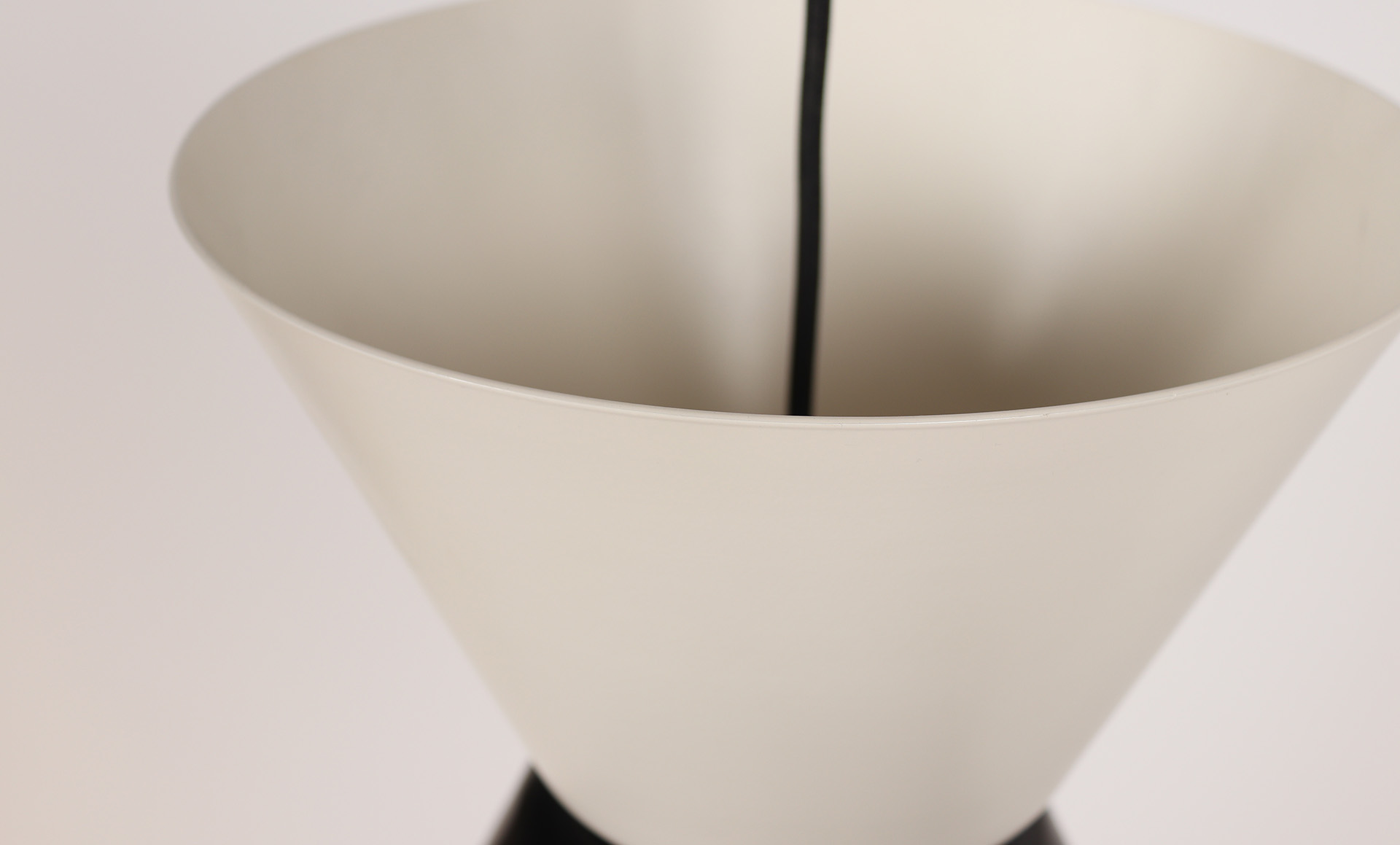 SAMPLE Alcum small pendant, NT-ALC-S2-03, 250mm Dia x 232mm. Featuring twin spun aluminium conical shades to two tone finish, top shade to Dulux Surfmist, bottom shade to matt black powder coat, with 2.0m black textile cord, hardwired dimmable 9W E27 LED. (Installation by electrician required, not included within price).