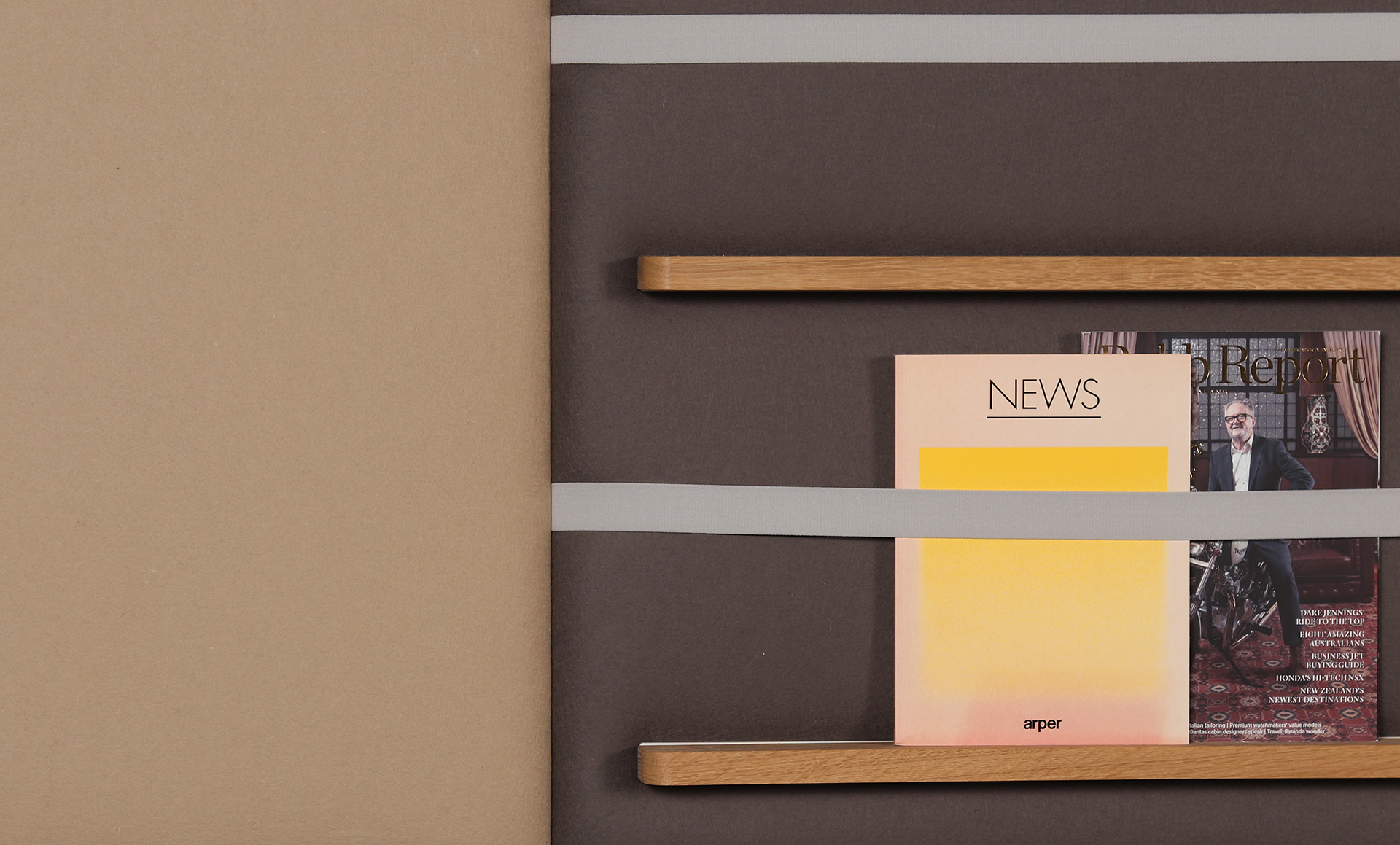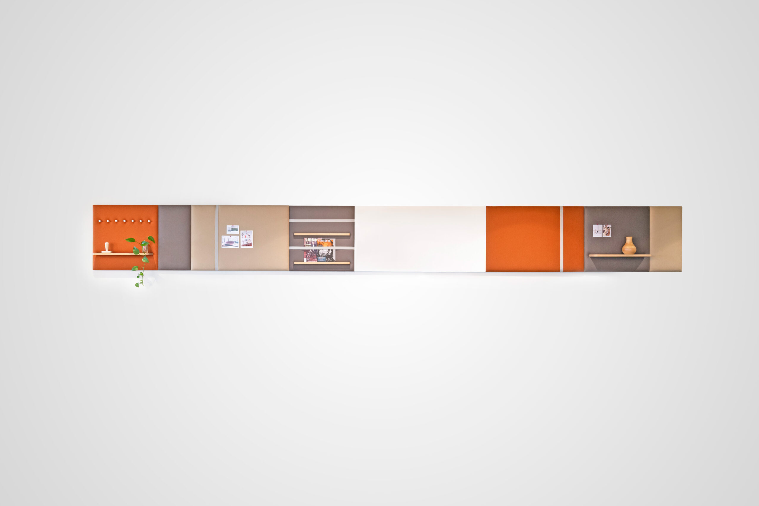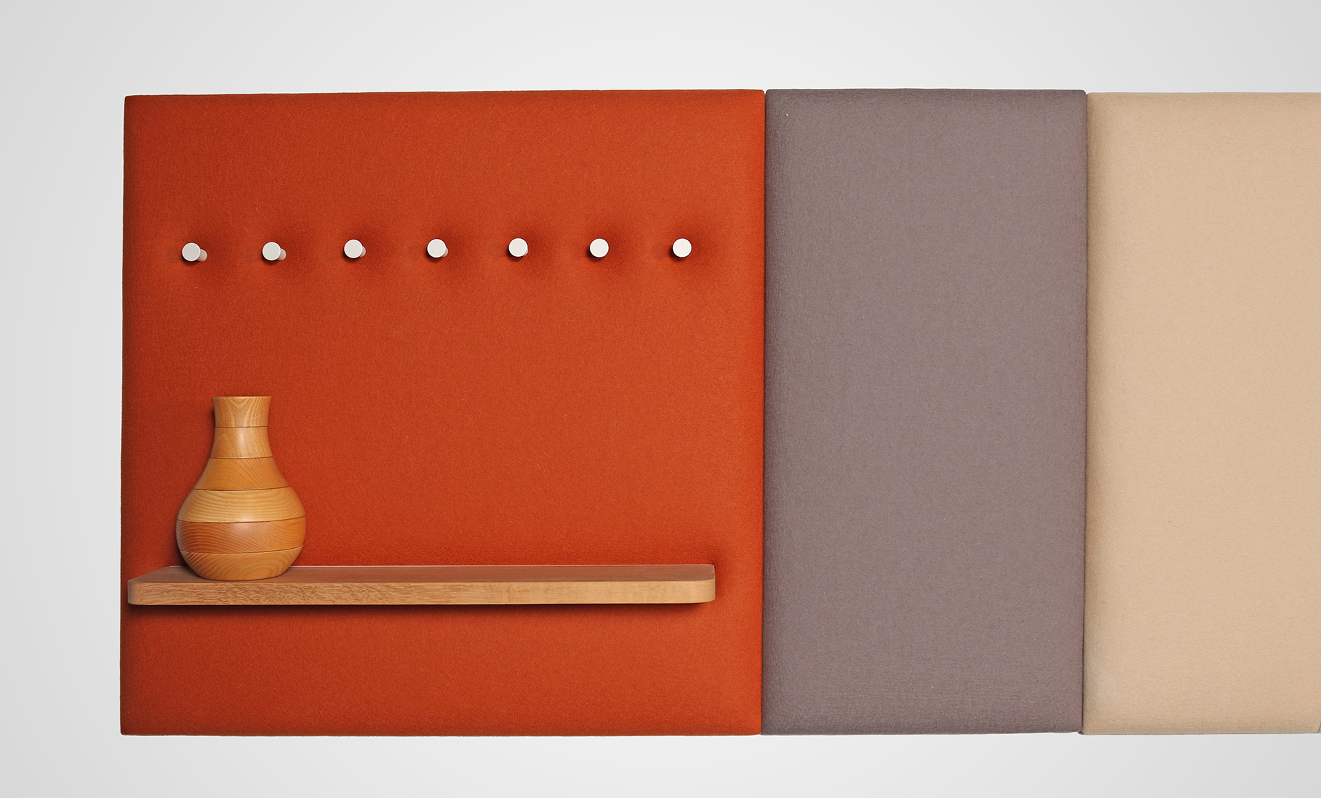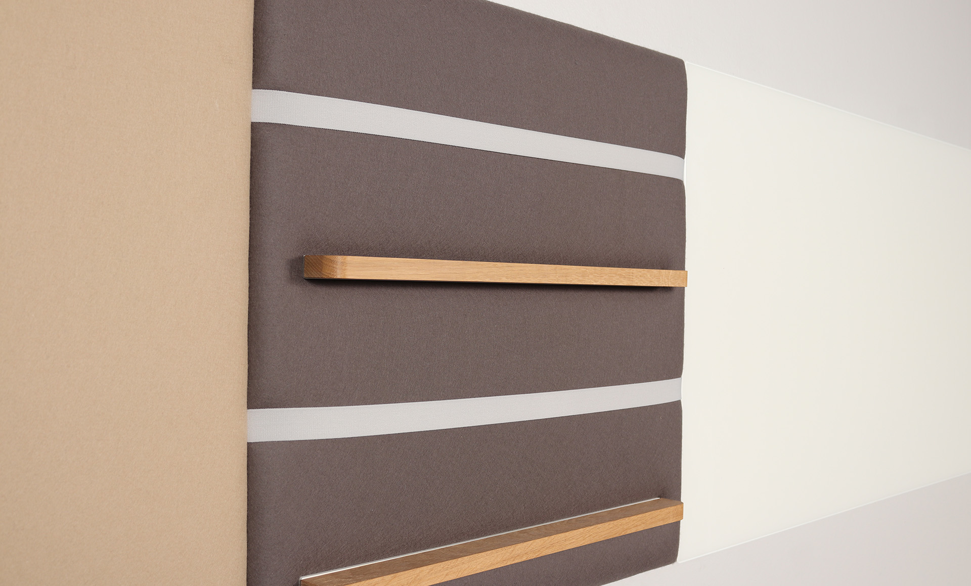 Striking yet functional in the office or education space are the Pillow Grid wall panels. This liner configuration comprises a range of wall mounted panels in a range woollen fabrics in complementary Autumnal colours. Adding functionality to the panels are accessories including coat hooks, shelving for display, magazine holders and whiteboard.