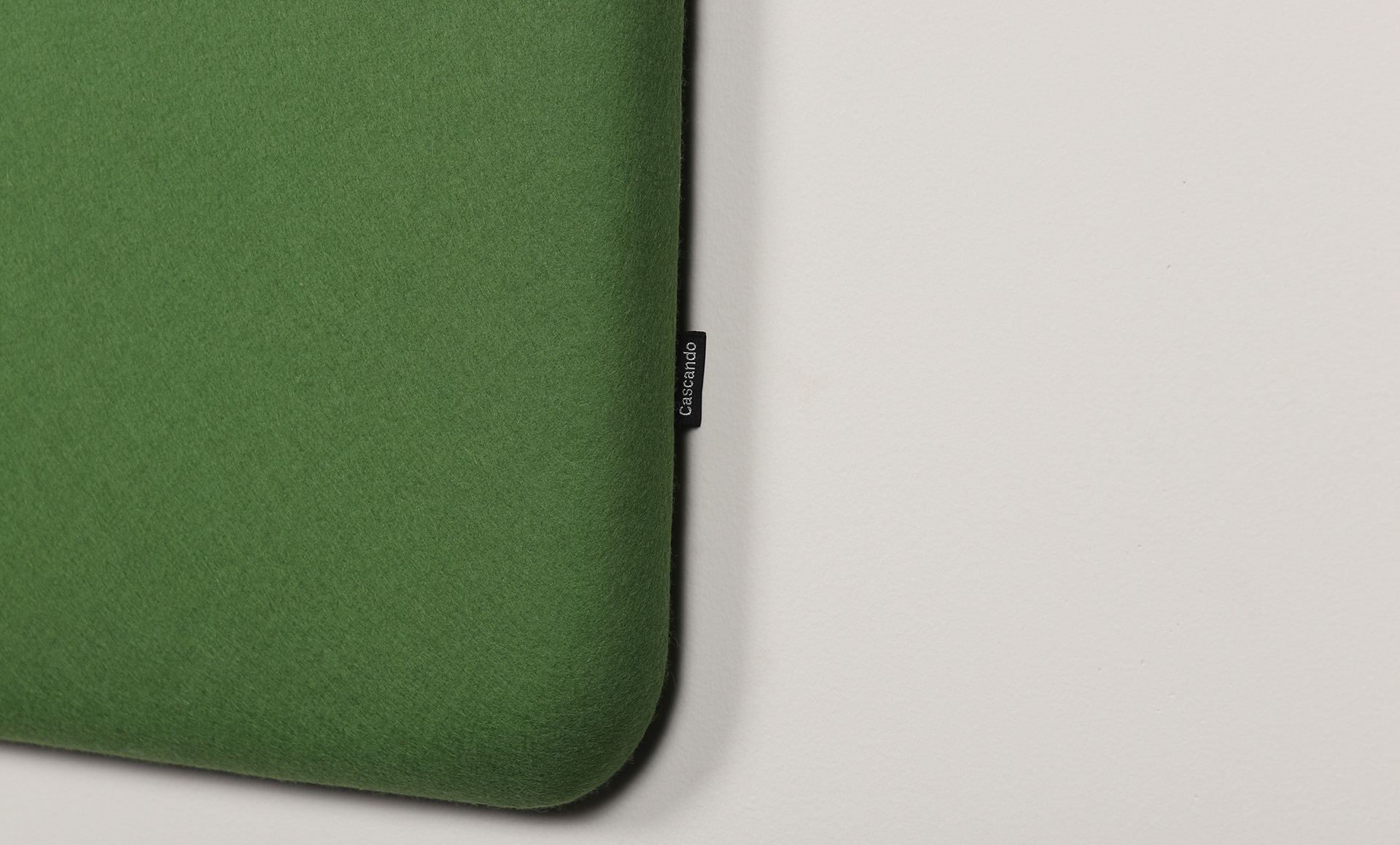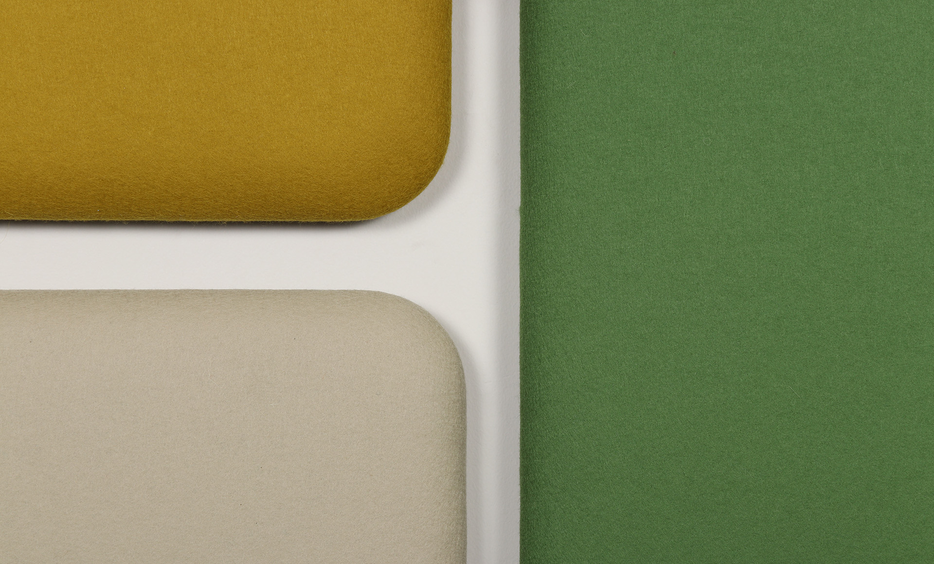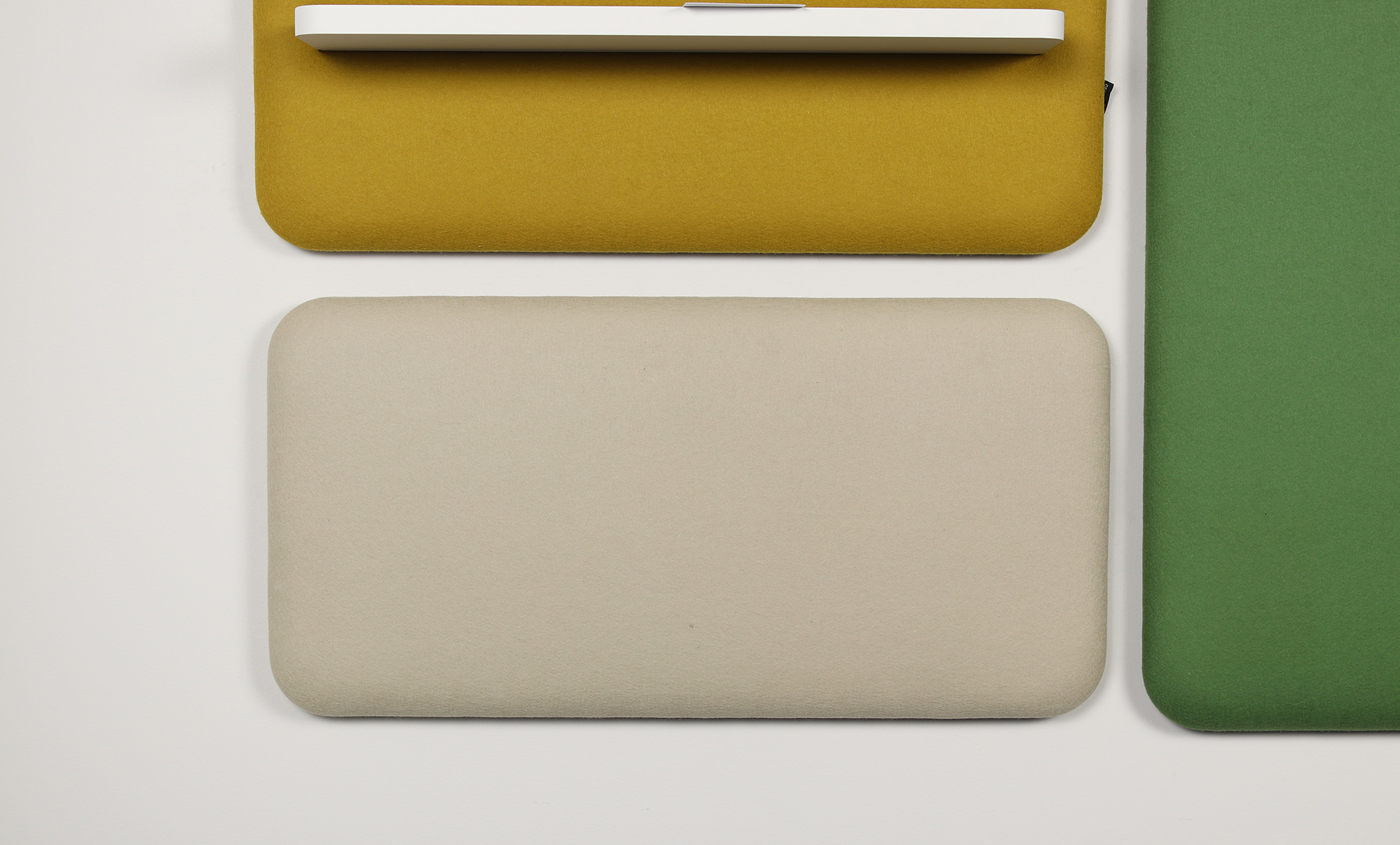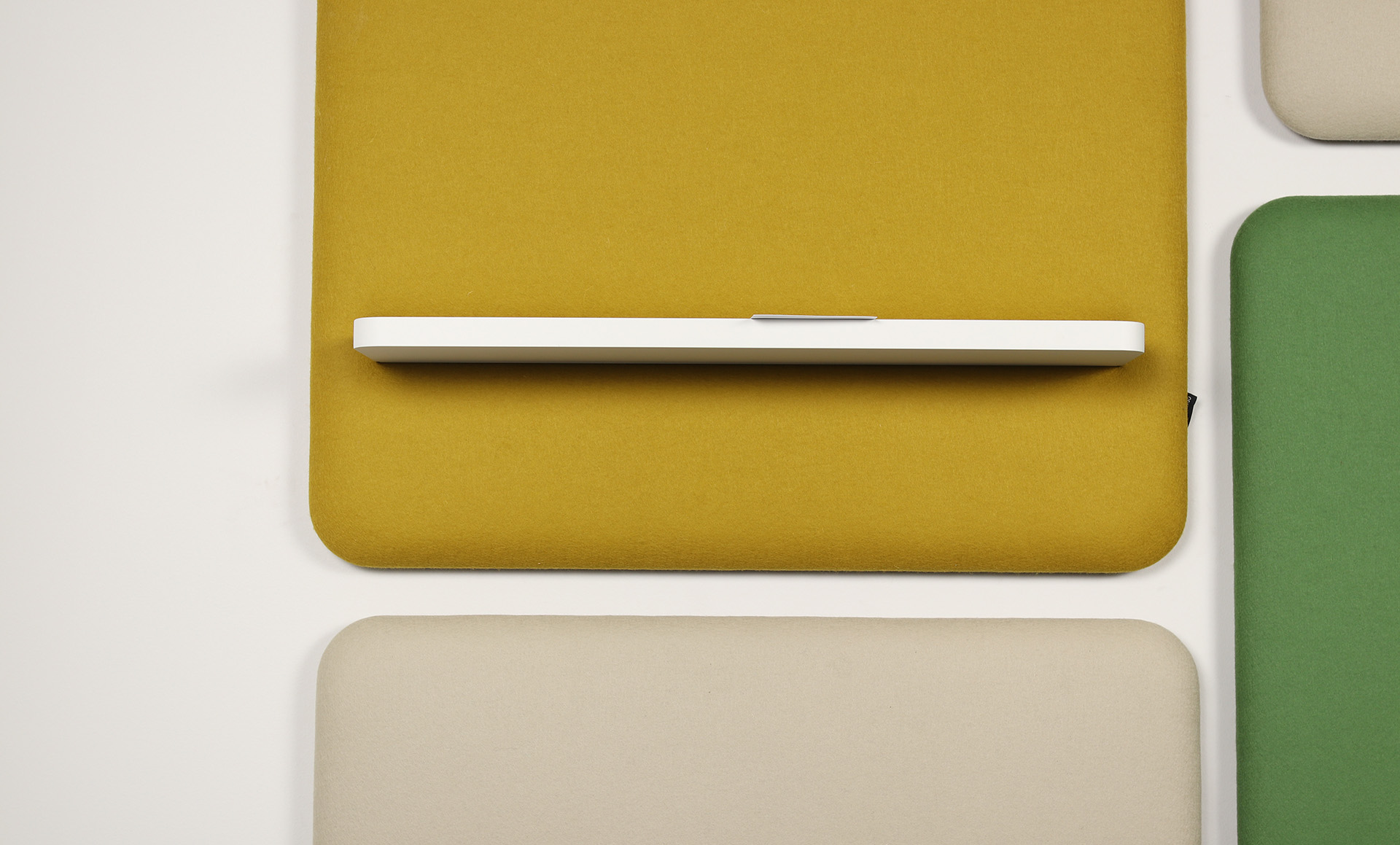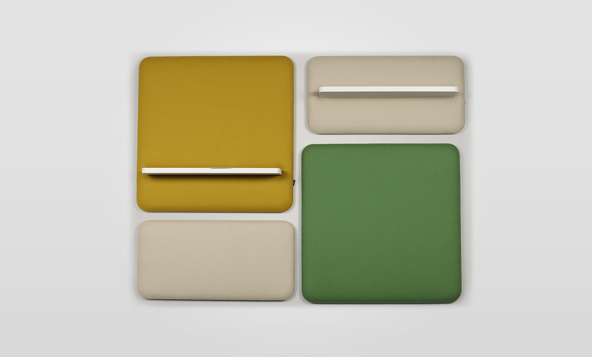 Striking yet functional in the office or education space are the Pillow Grid wall panels. This liner configuration comprises a range of wall mounted panels in a range woollen fabrics in complementary colours. Adding functionality to the panels are shelving for display of small objects.