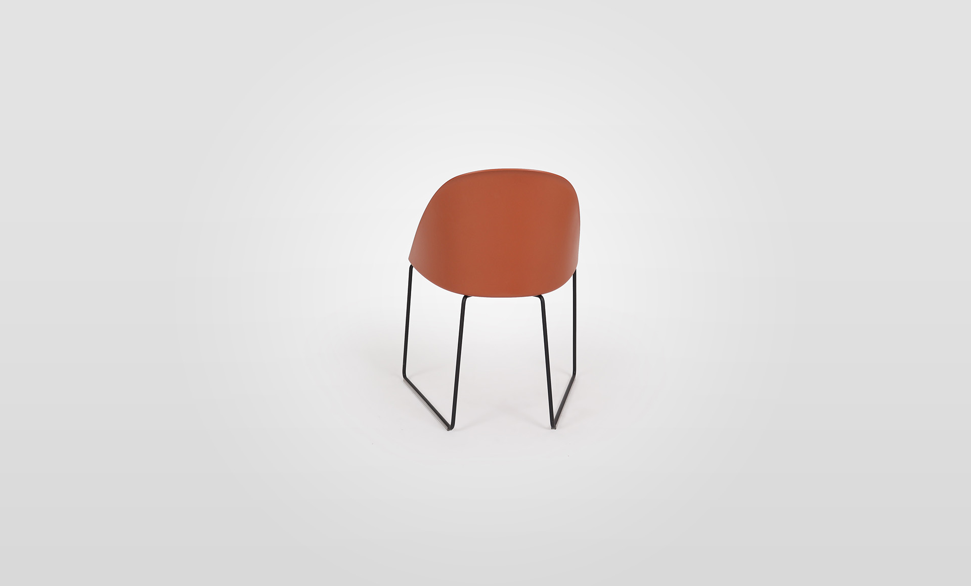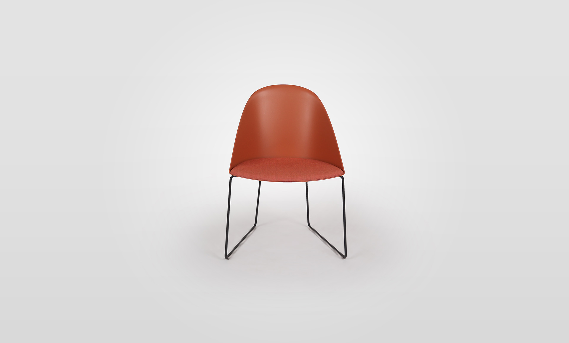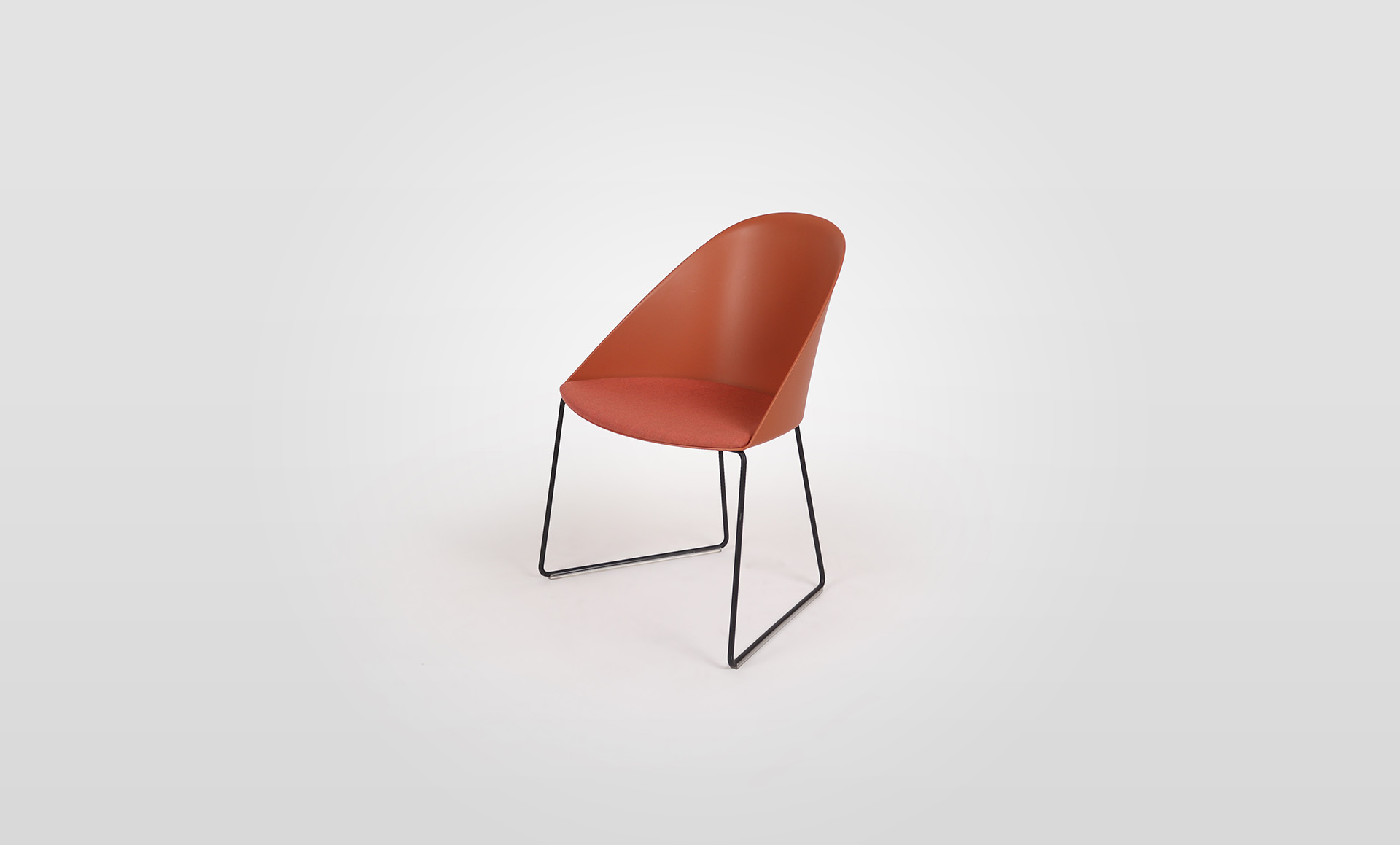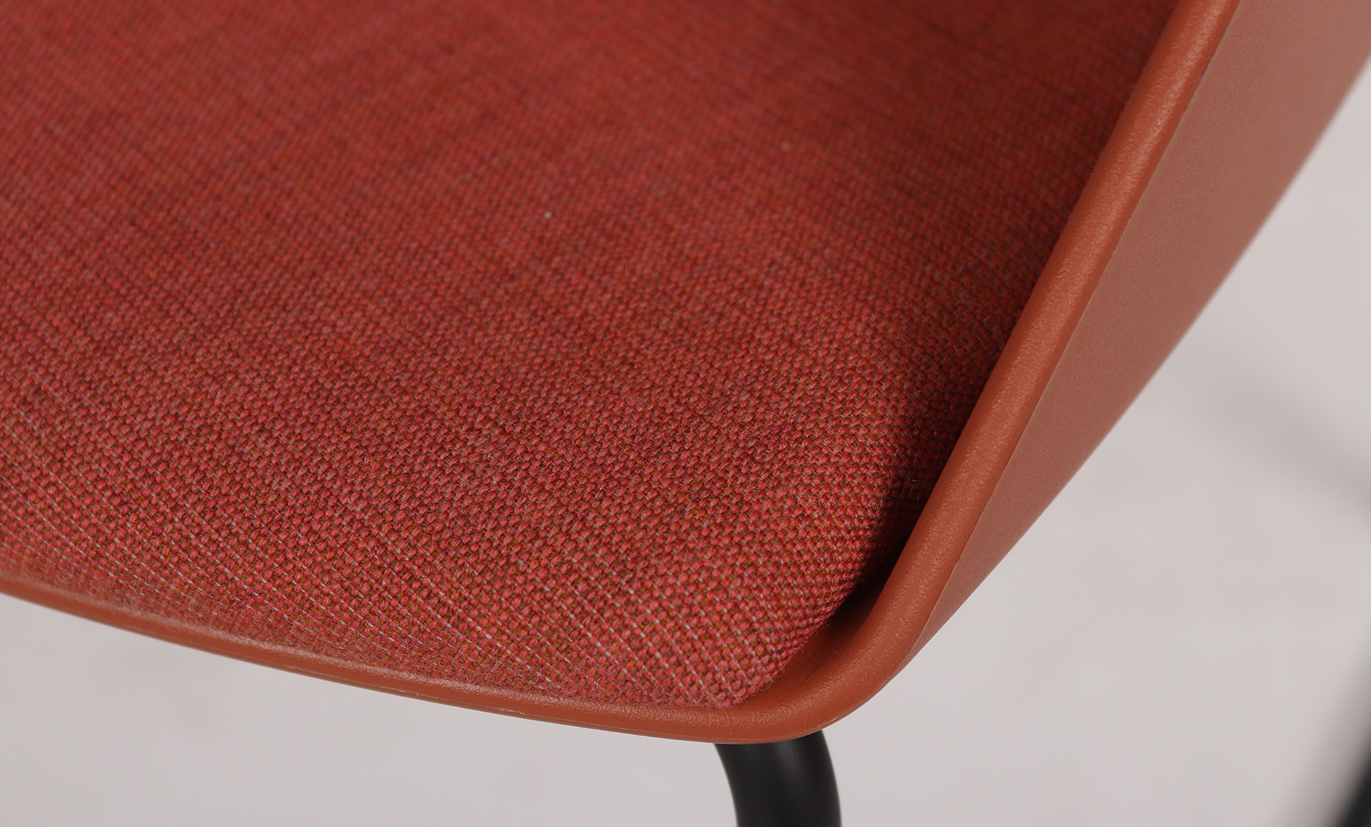 Comfortable and lightweight, the Cila polypropylene shell in Rust with seat cushion upholstery in Group Rust Red fabric on a mild steel sled base finished to Matte Black powdercoat with Polycarbonate glides.