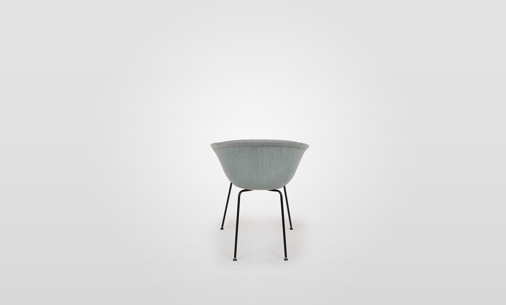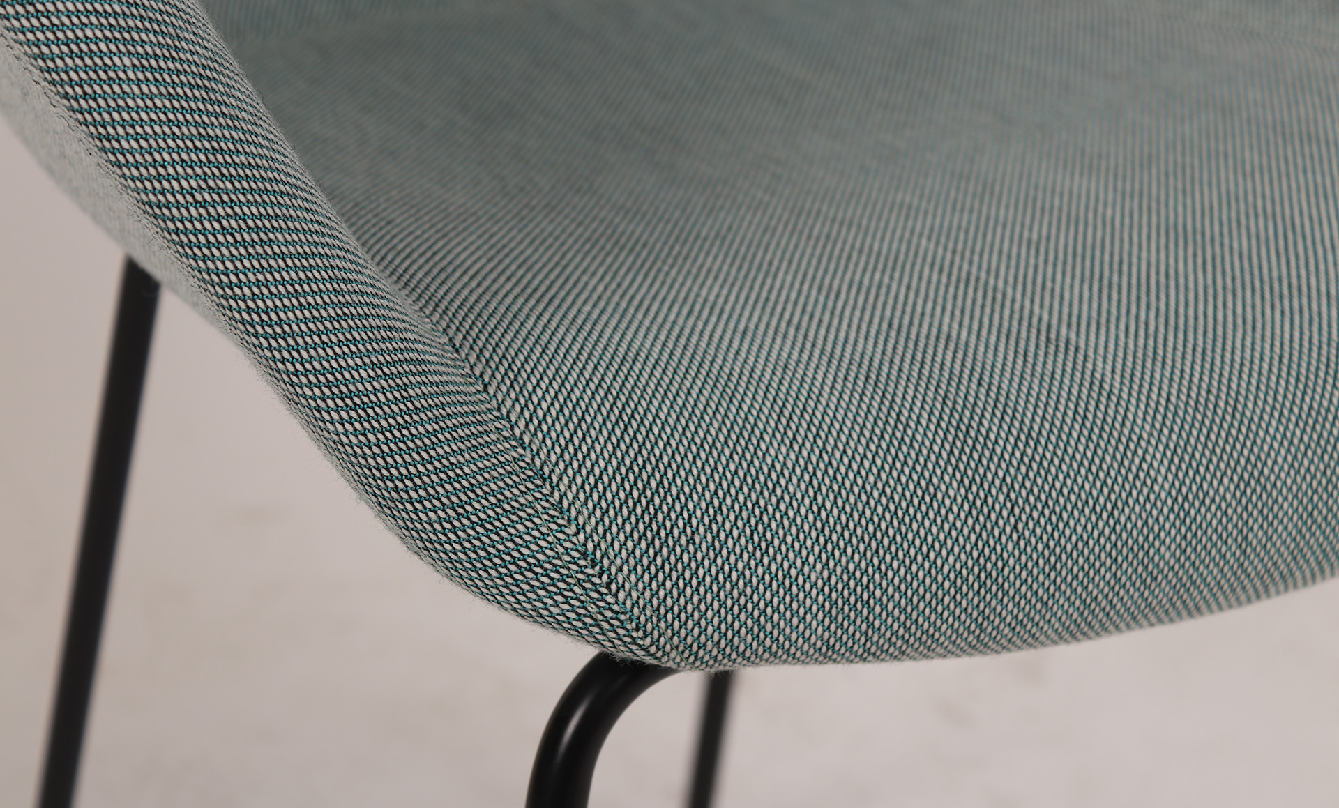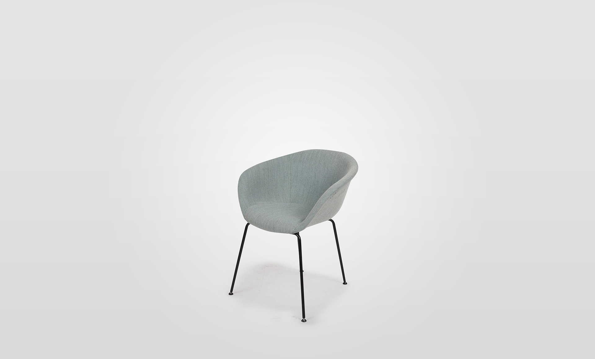 Duna 02 features a fully upholstered polypropylene shell, upholstered in a light-green fabric, on a mild steel 4-leg frame in house powder coat finish, colour black.