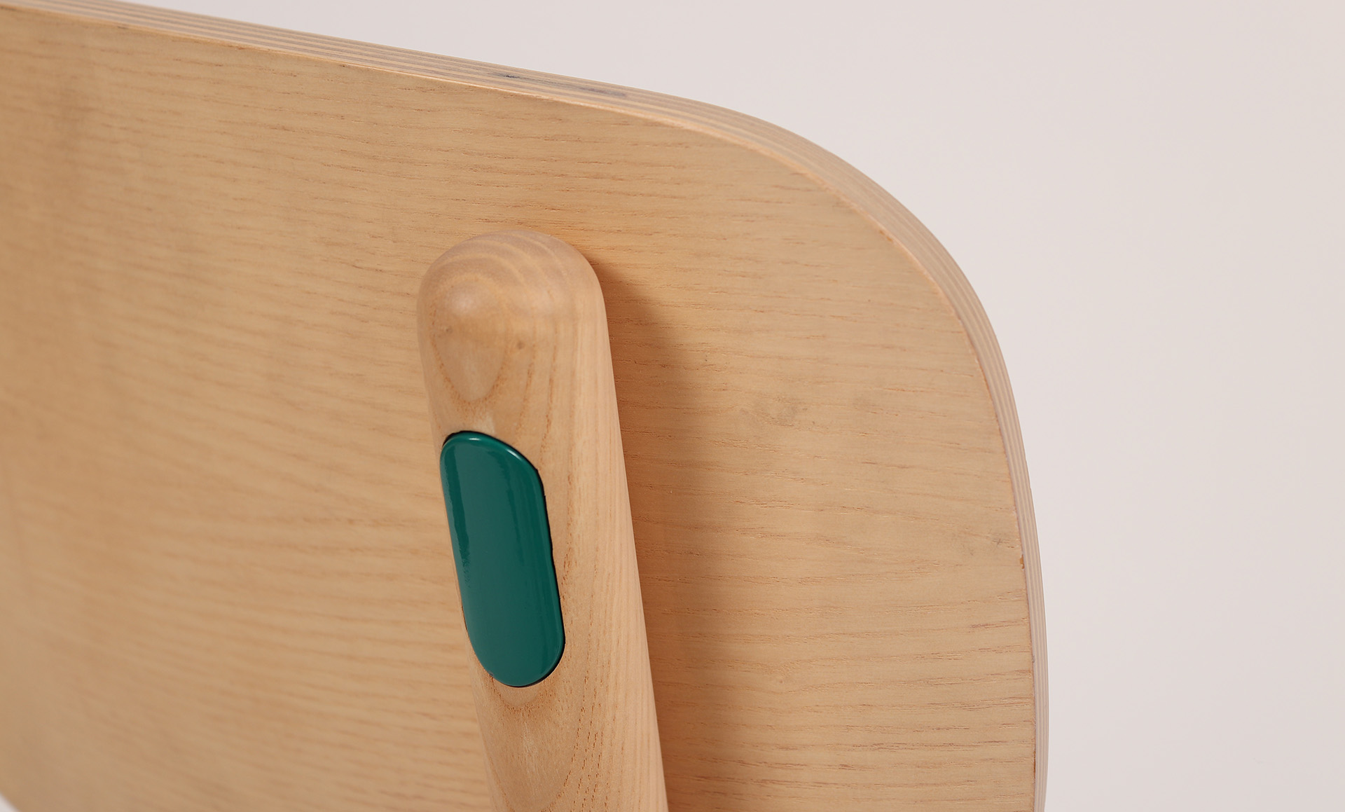 Manufactured with a solid Ash timber frame and plywood backrest, this chair is finished in a natural stain. The characteristic powdercoat detail of the Okidoki range is in the form of a coloured dress cap in the colour Blanc within the timber frame.