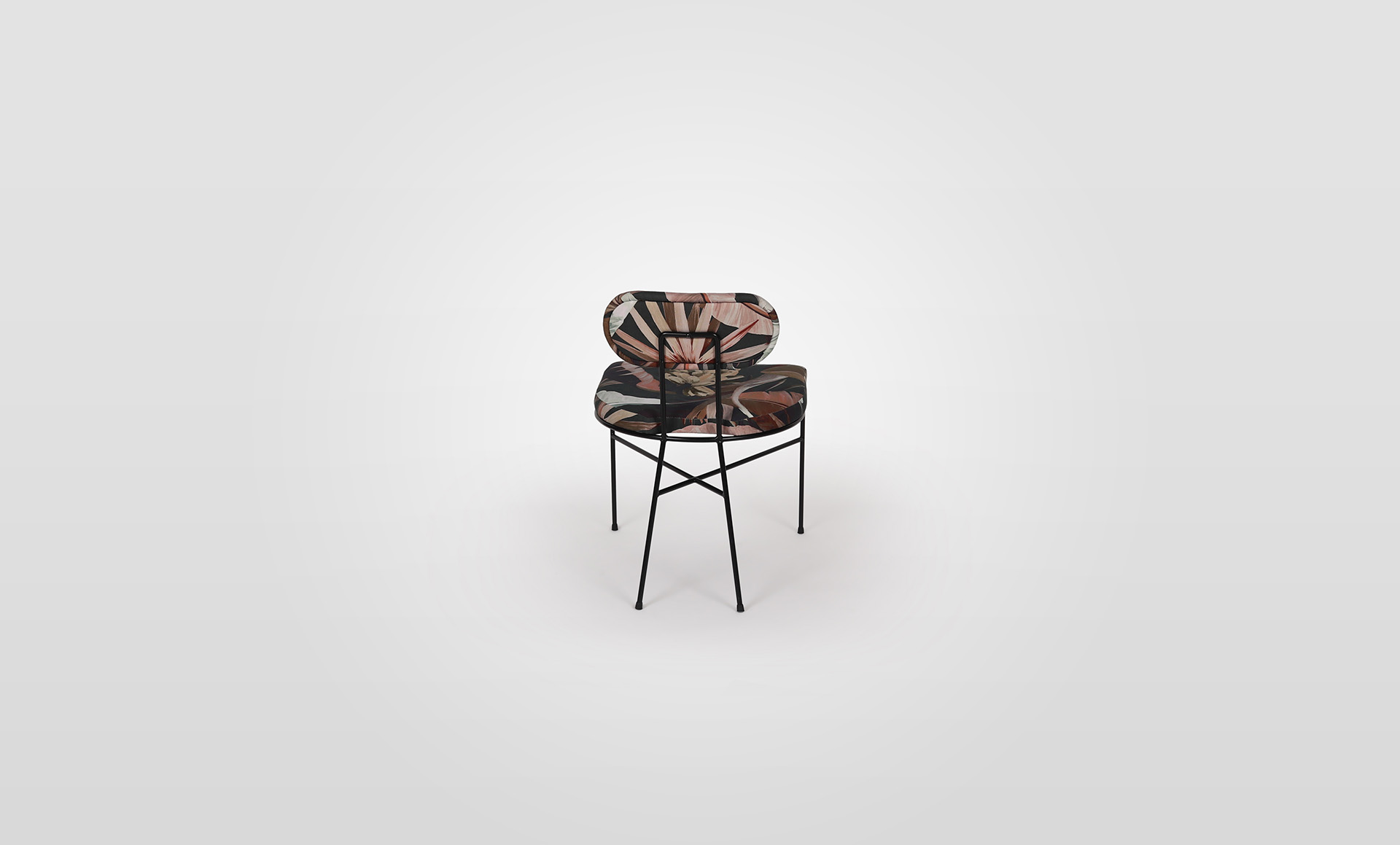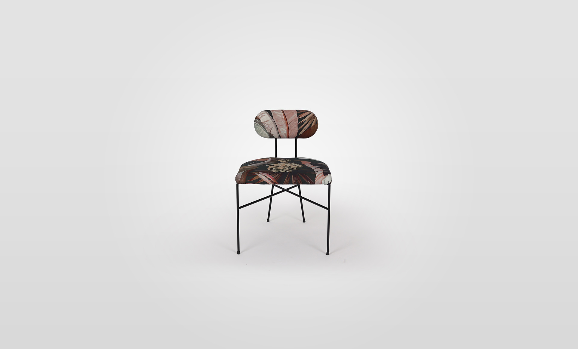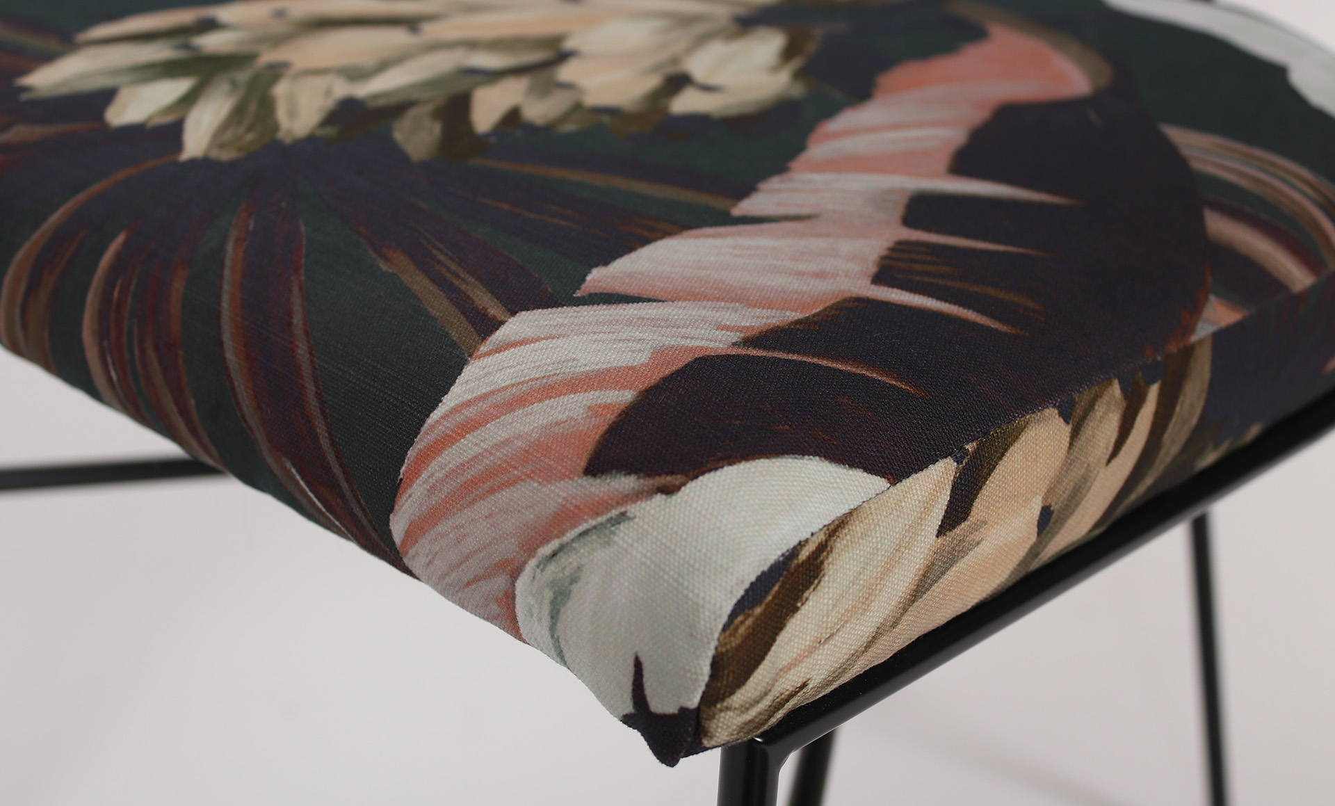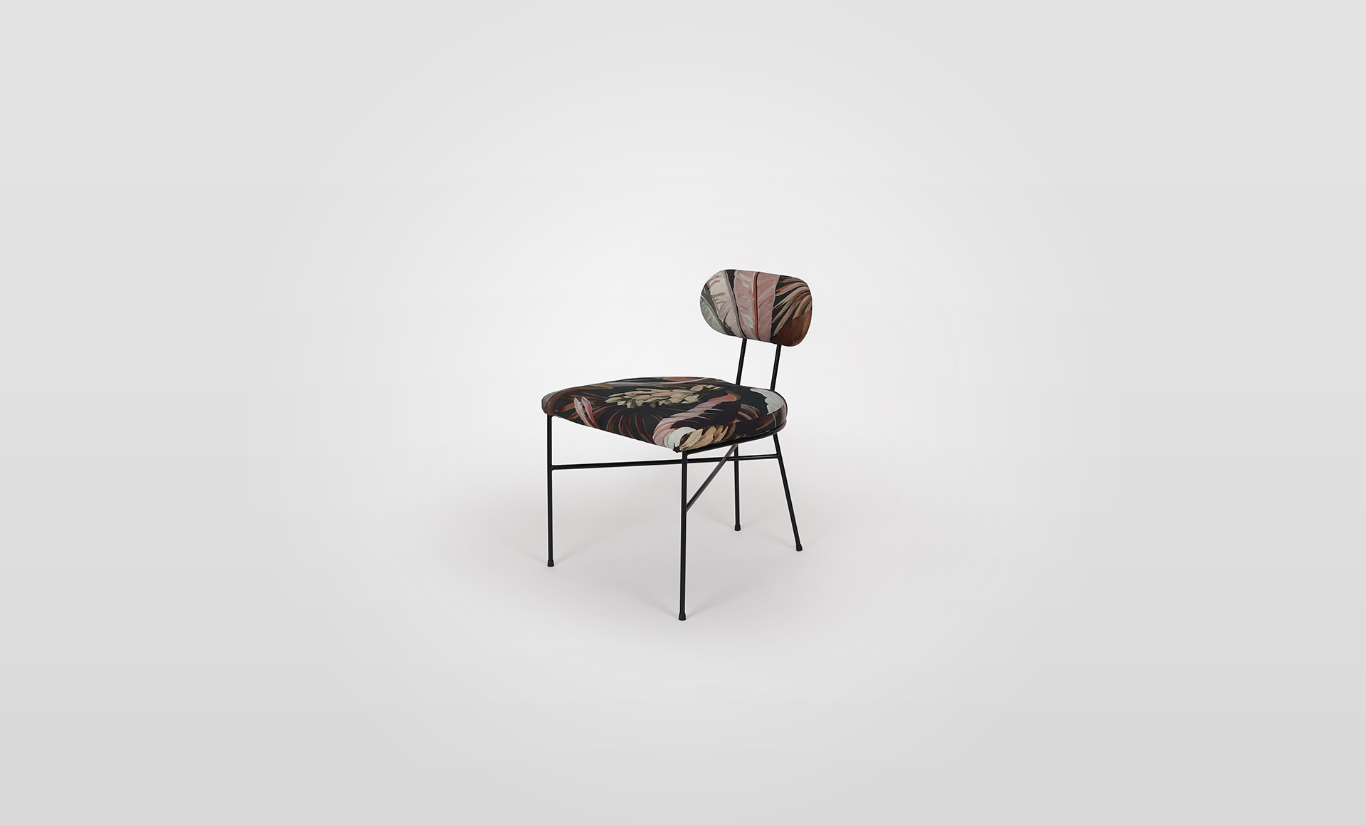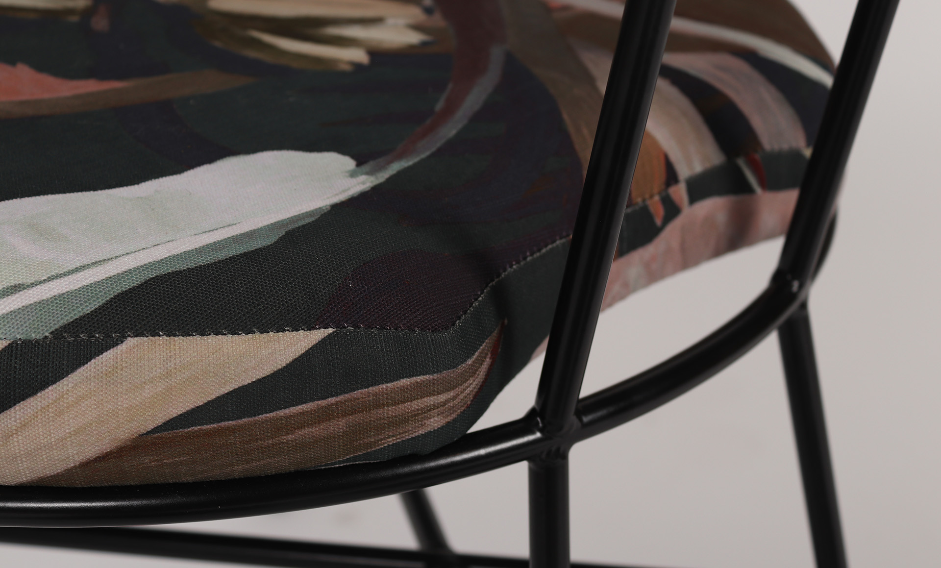 With smooth, strong lines and curvature embracing an Art Deco aesthetic. The seat and backrest are fully upholstered in Mokum Troplicalia – Sepia 894 (foral) fabric, with the frame powder coated to black.