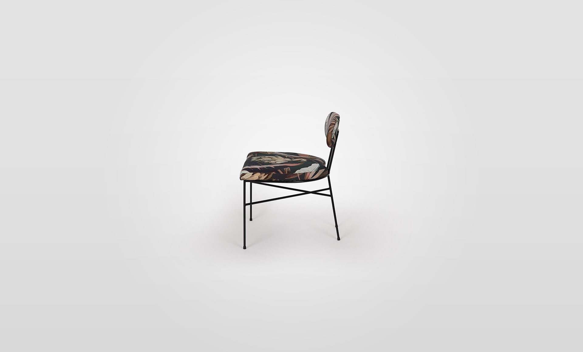 With smooth, strong lines and curvature embracing an Art Deco aesthetic. The seat and backrest are fully upholstered in Mokum Troplicalia - Sepia 894 (foral) fabric, with the frame powder coated to black.