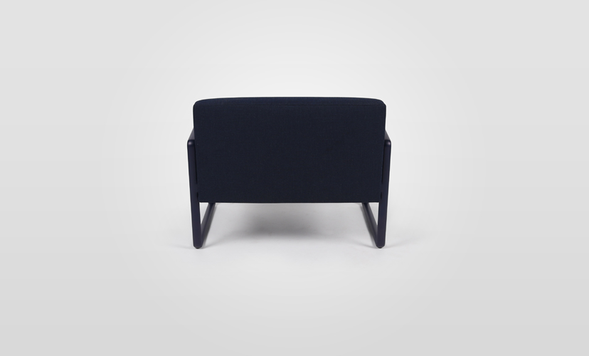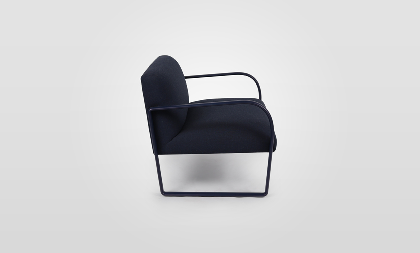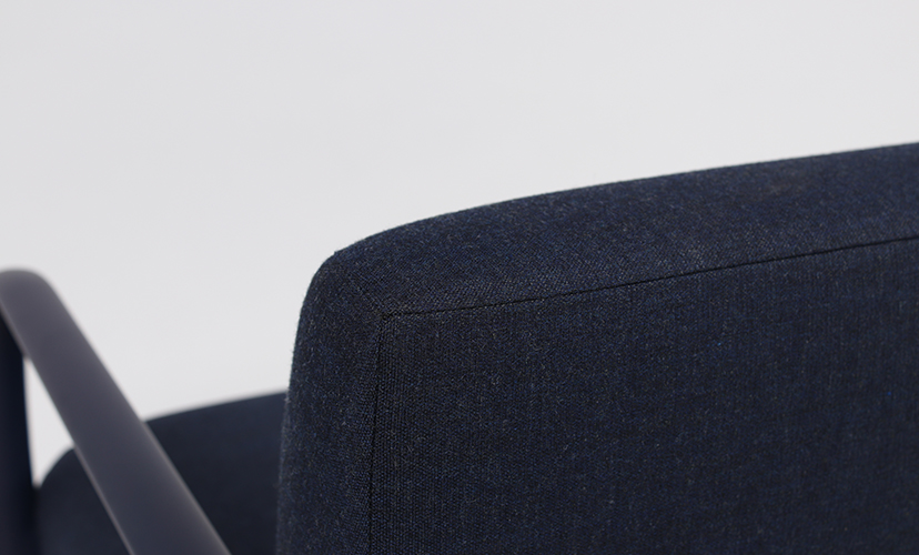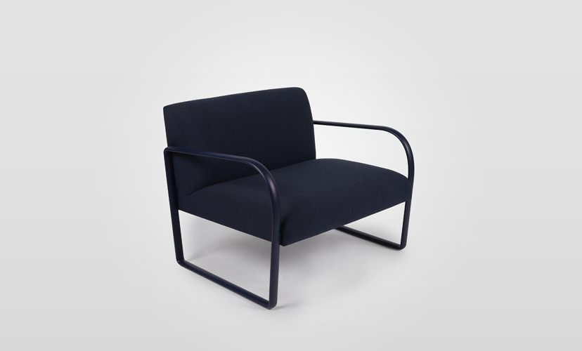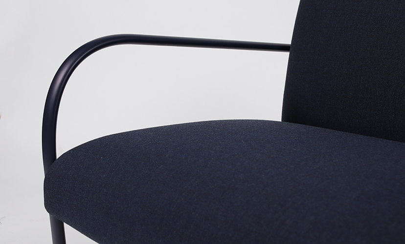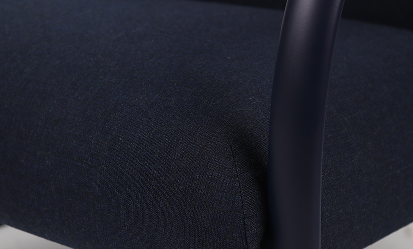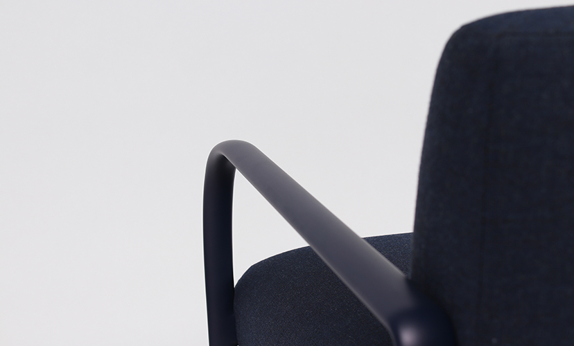 SAMPLE Arcos Armchair with sled base and integrated armrests, Art. 6101, 880mm x 730mm x 700mm, SH 400mm. Shell in metal and plywood upholstered in Group F House Fabric, Kvadrat Canvas 2, 794, with aluminium armrest and sled base powdercoat to V59 matt.