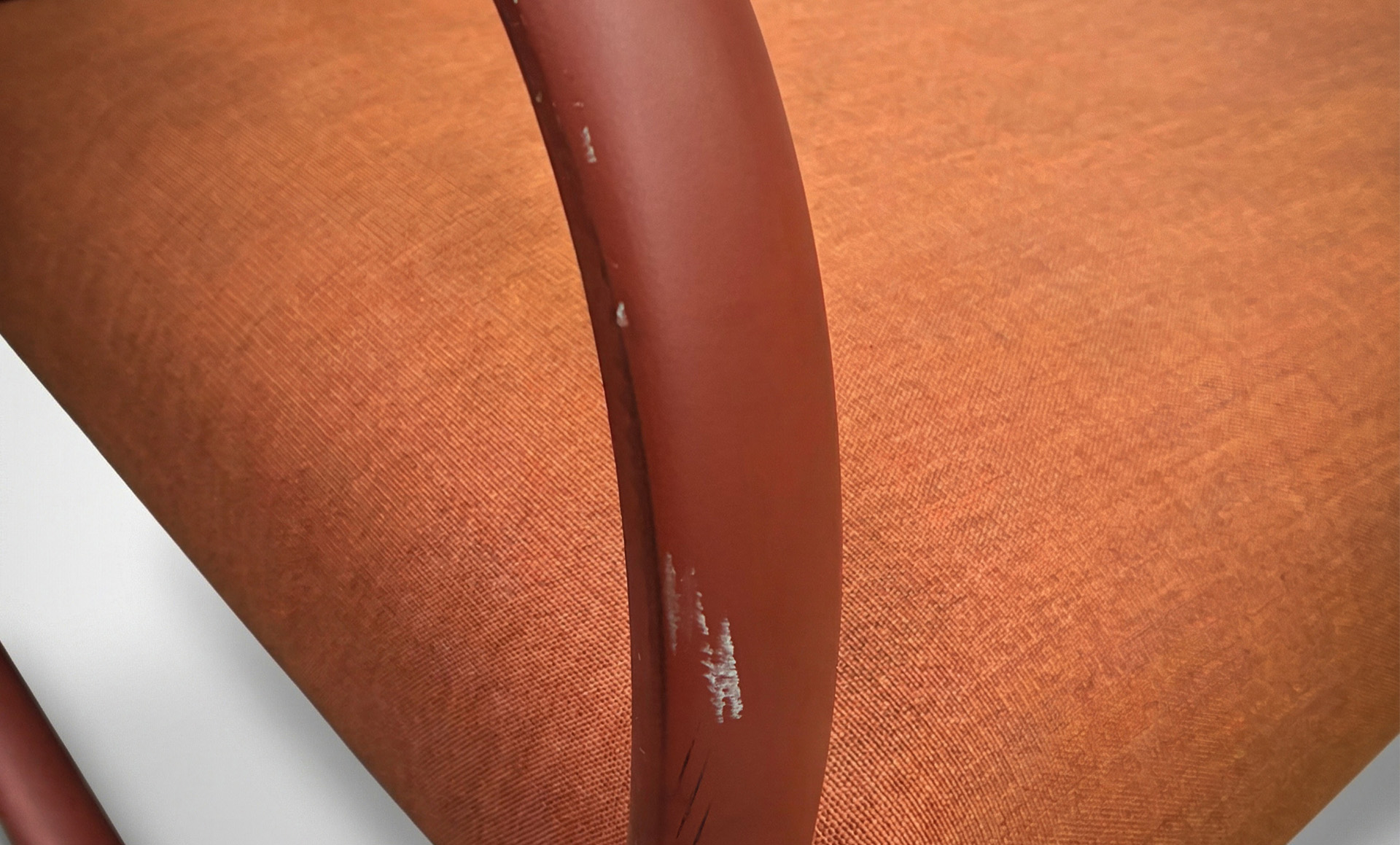 This item is ex-showroom display and is showing signs of use, including scratches and scrapes to the powder coated frame around the armrest and lower base, the upholstery remains in good condition.