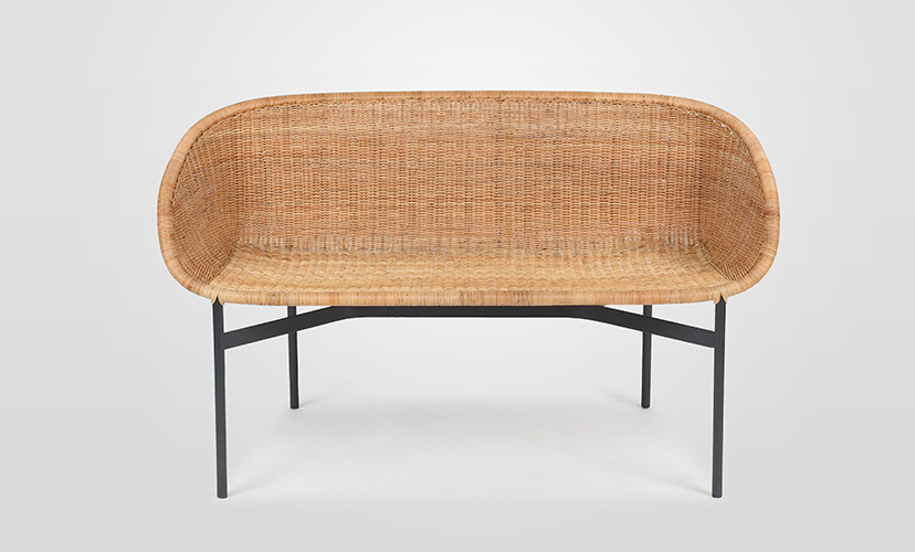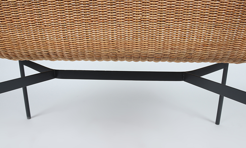 SAMPLE Clara lounge chair bench, indoor, 1330mm x 640mm x 800mm, seat height 450mm, featuring a woven shell in rattan finished to Natural on a 4-leg mild steel base finished to charcoal powdercoat.