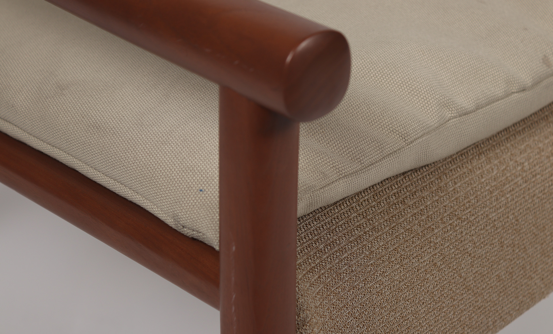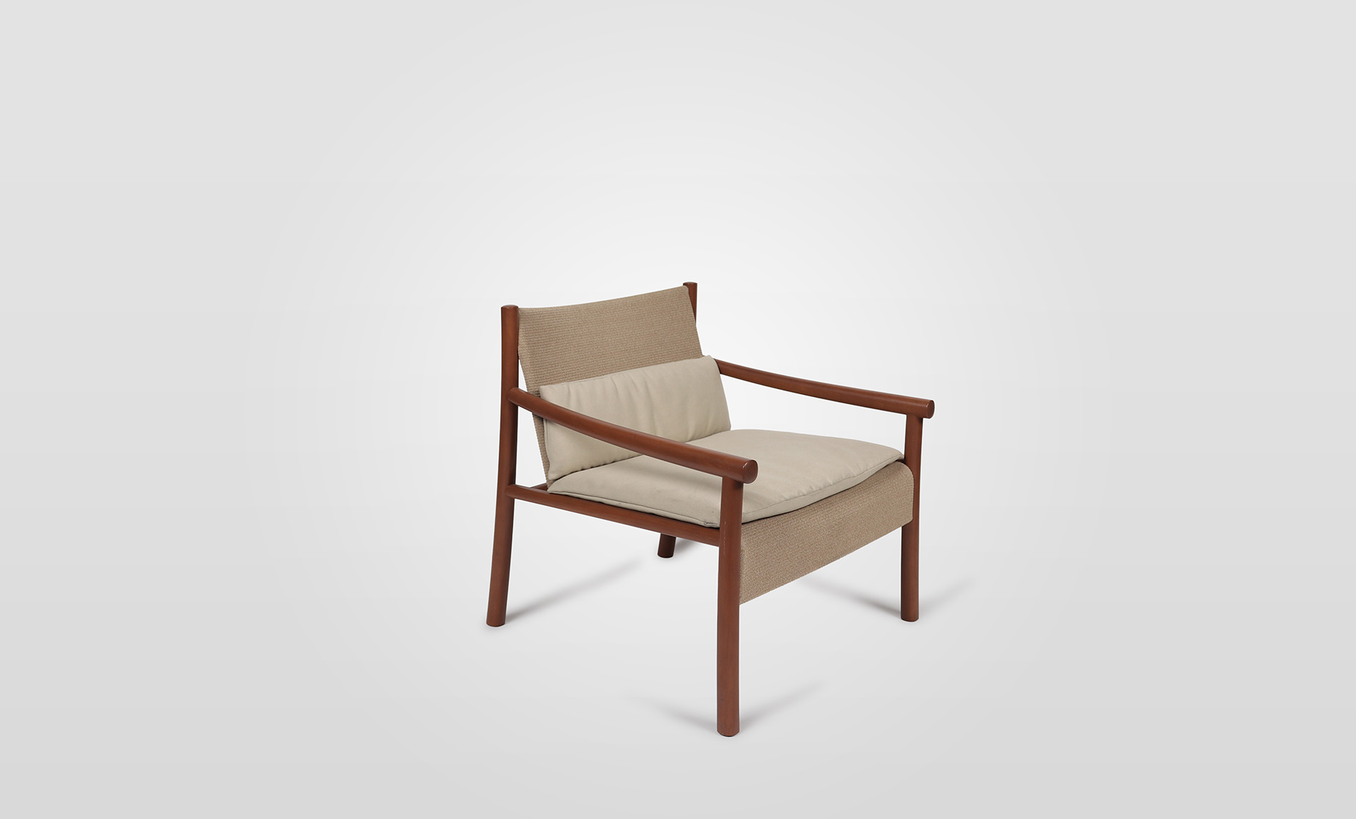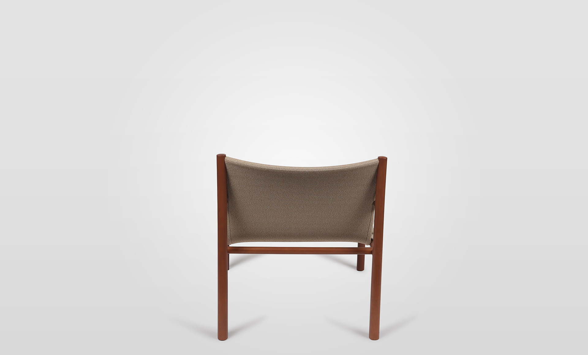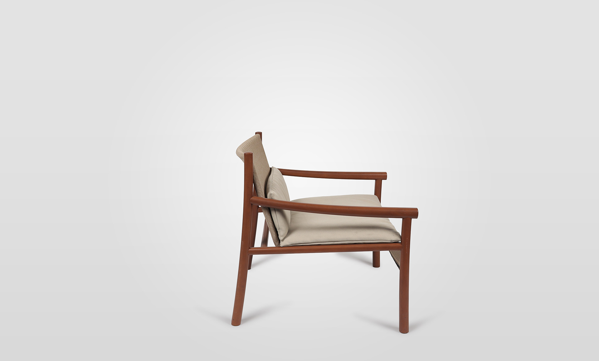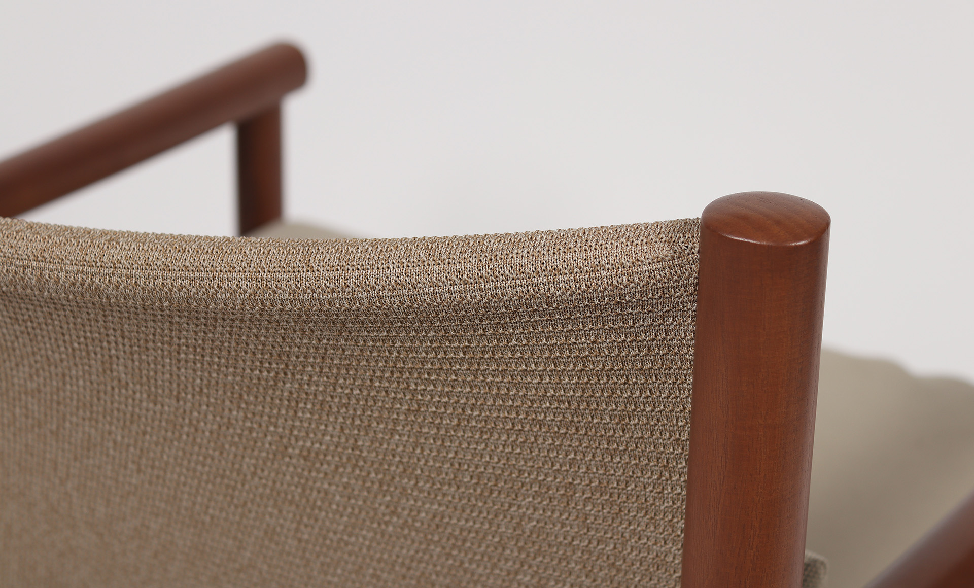 Suitable for indoor or outdoor use, the Kata arfmchair features a black locust (colour Teak)FSC certified wooden frame supporting a tailor-made 3D knit textile. The knit cover is created from recycled polyester made from post-consumer plastic that is converted into durable and lightweight fibers.