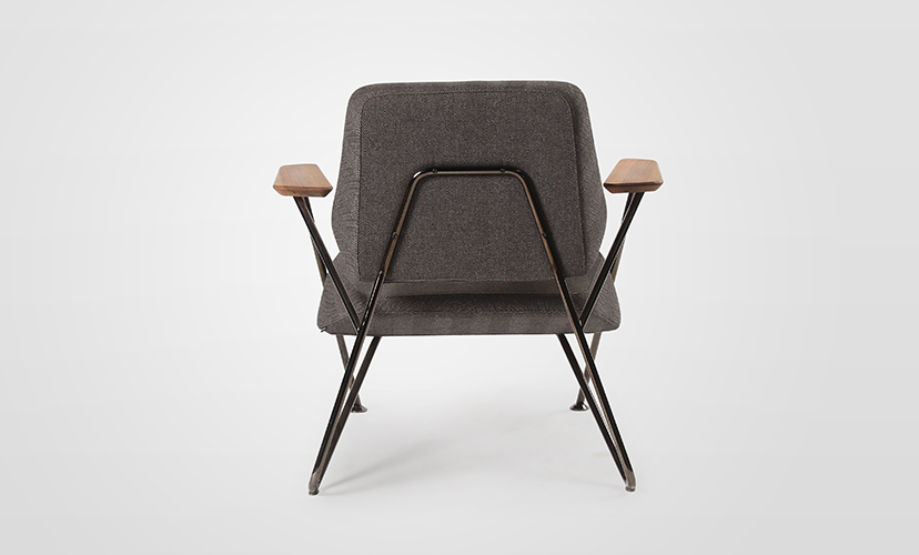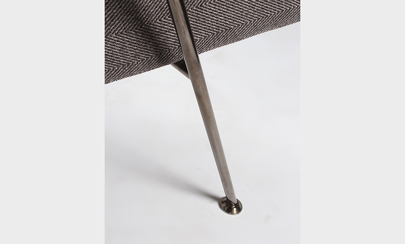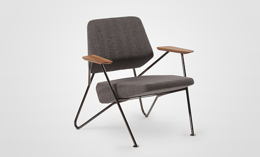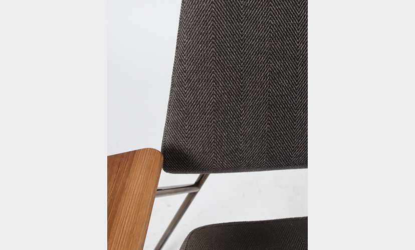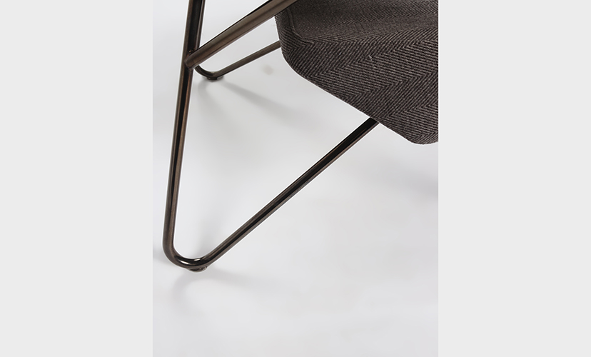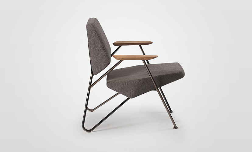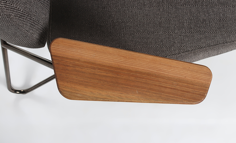 The Polygon features a separate seat and back upholstered in a Prostoria house fabric, Fishbone, on a mild steel frame finished to black chrome with armrests in solid timber finished to Walnut stain.