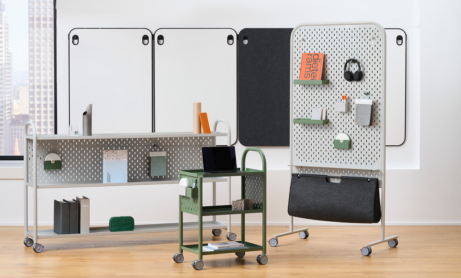 The HIVE collection designed by Tom Skeehan addresses the needs of the modern workplace, seamlessly blending the static and the mobile. HIVE Messenger can be used stationary or moved around within the workspace. They perfectly accompany the Traveller, Shelf, Duo Wall Panels and Creative TV Display, providing versatile storage. Swivel castors allow for the units to easily be moved into different areas of the workspace and then become stationary with the breaking mechanism.