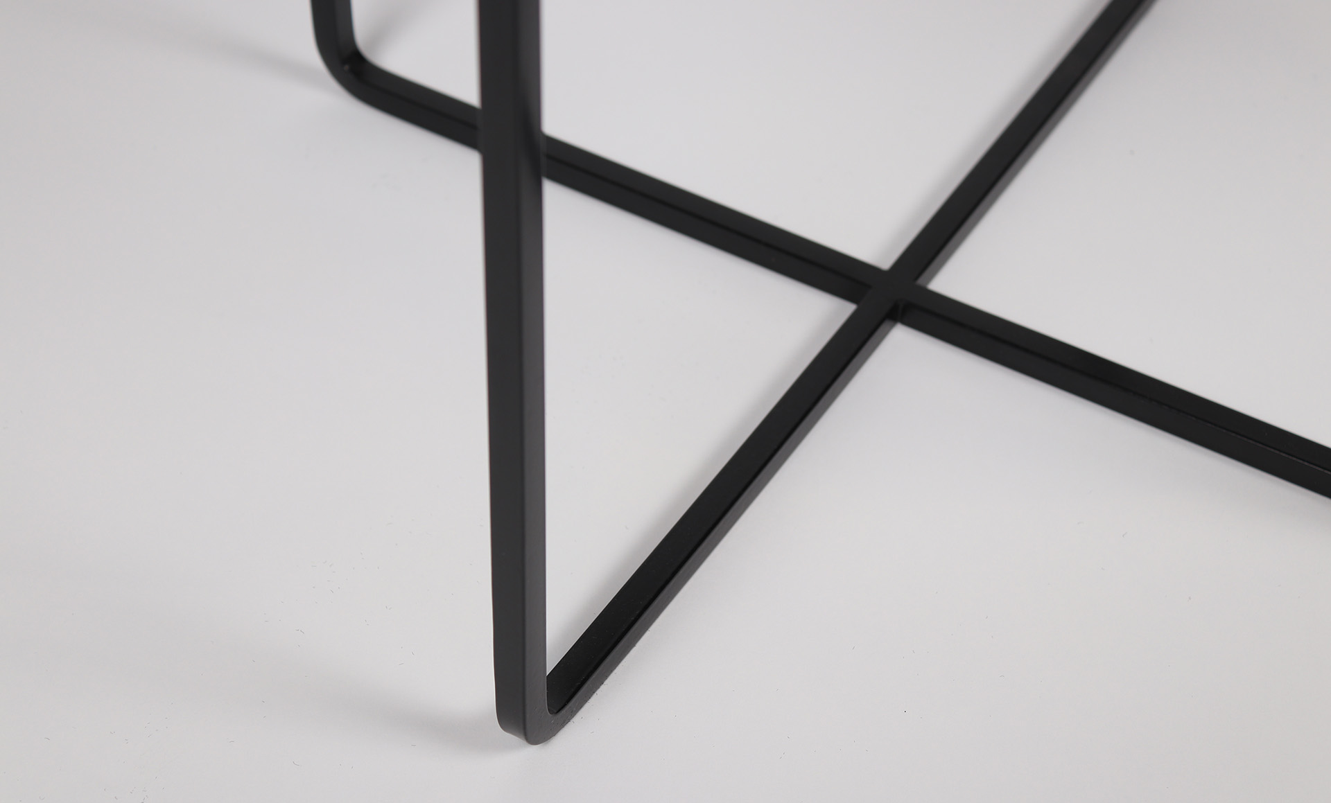 From the Stylecraft house collection, the Short Legs coffee table comprise a 3mm thick inset table top with 10mm x 10mm surround, the frame structure of 10mm solid rod steel in a 4-way configuration with 20mm radius bend and cross halving joint to center of base. This ityem is finished to black powdercoat.
