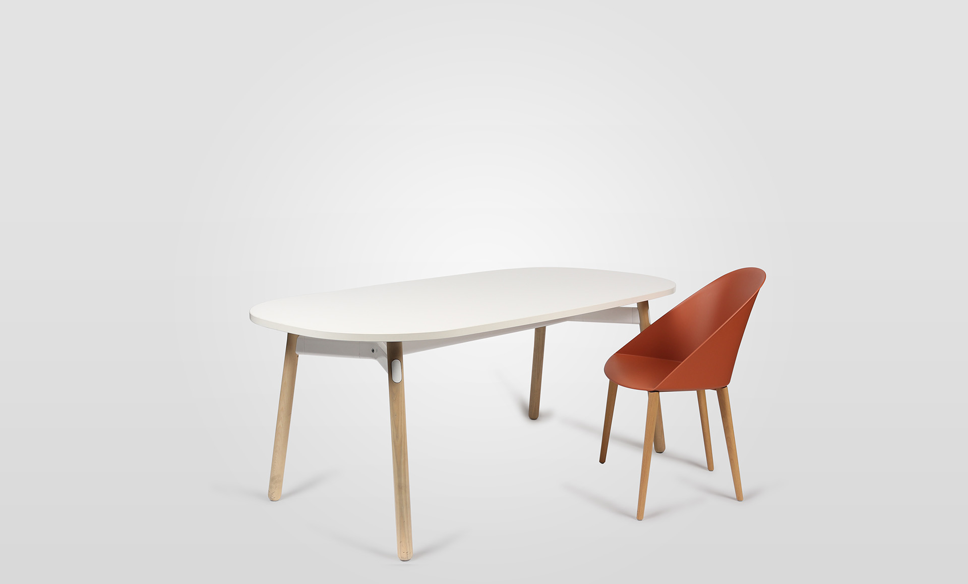 Okidoki is a cleverly designed meeting table by Thinking Works that brings a sense of playfulness to the workspace. Okidoki features a rounded white melamine table top, with solid American Ash legs in natural finish. The aluminium and steel framework is finished in white powder coat.