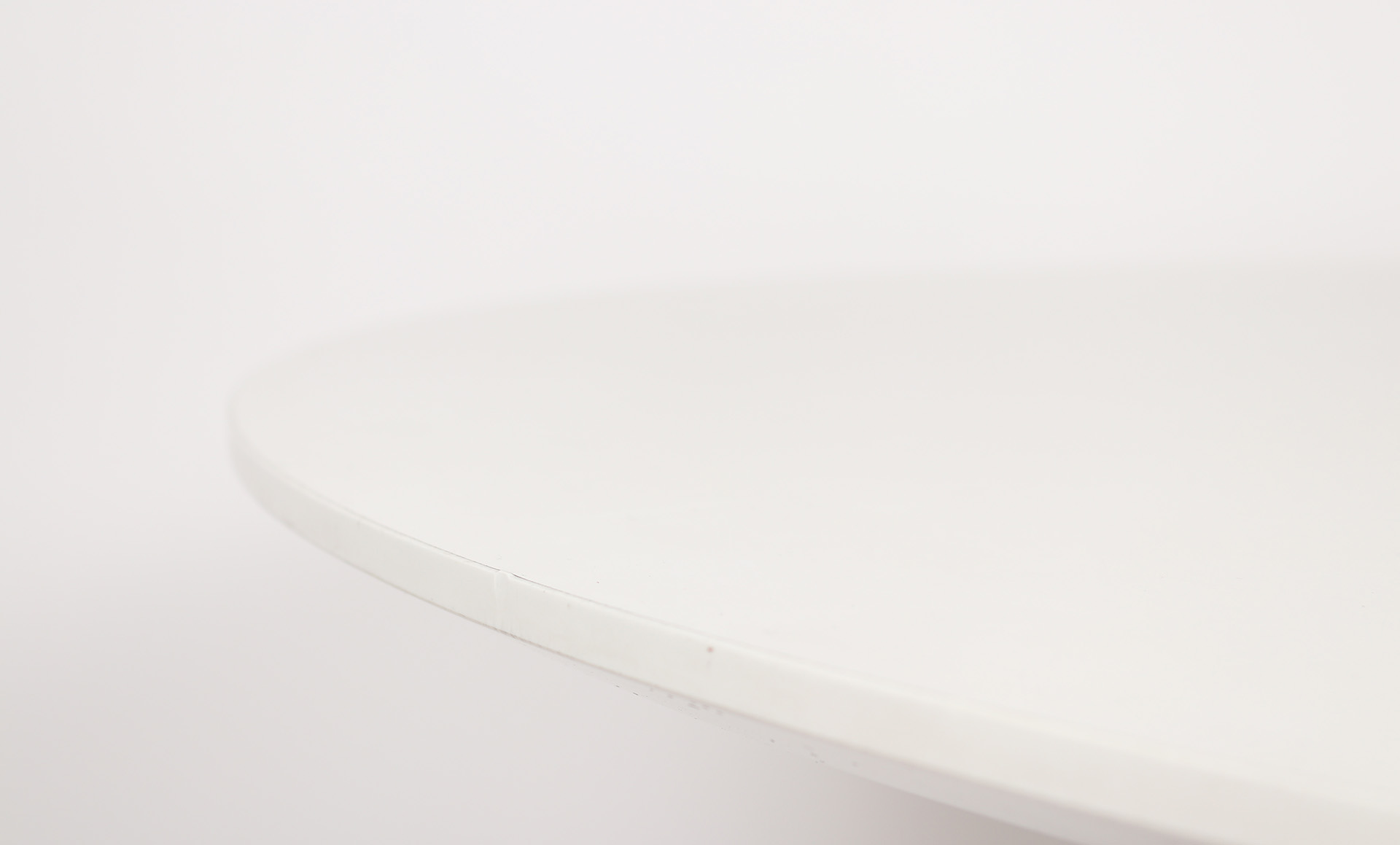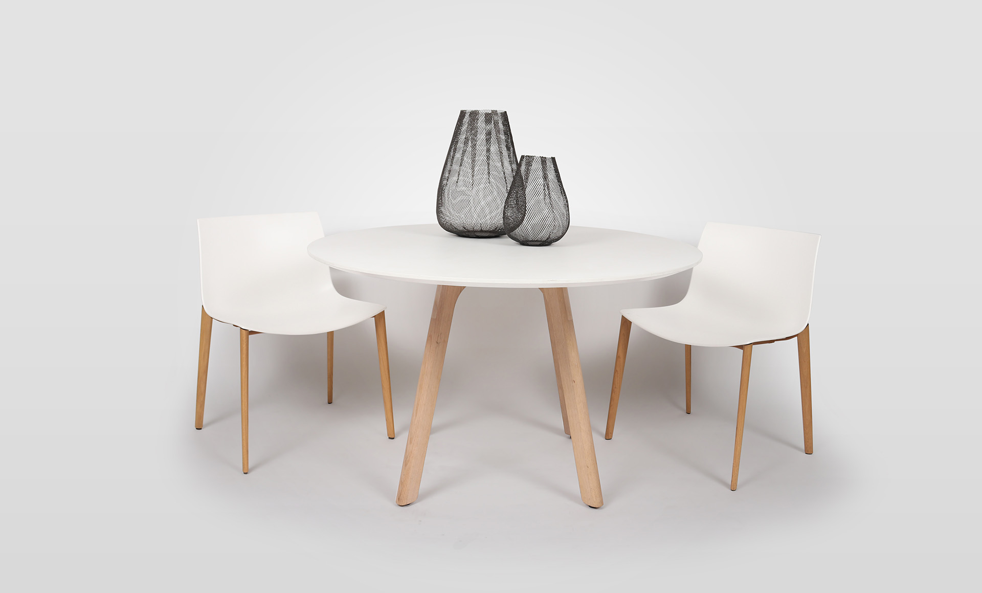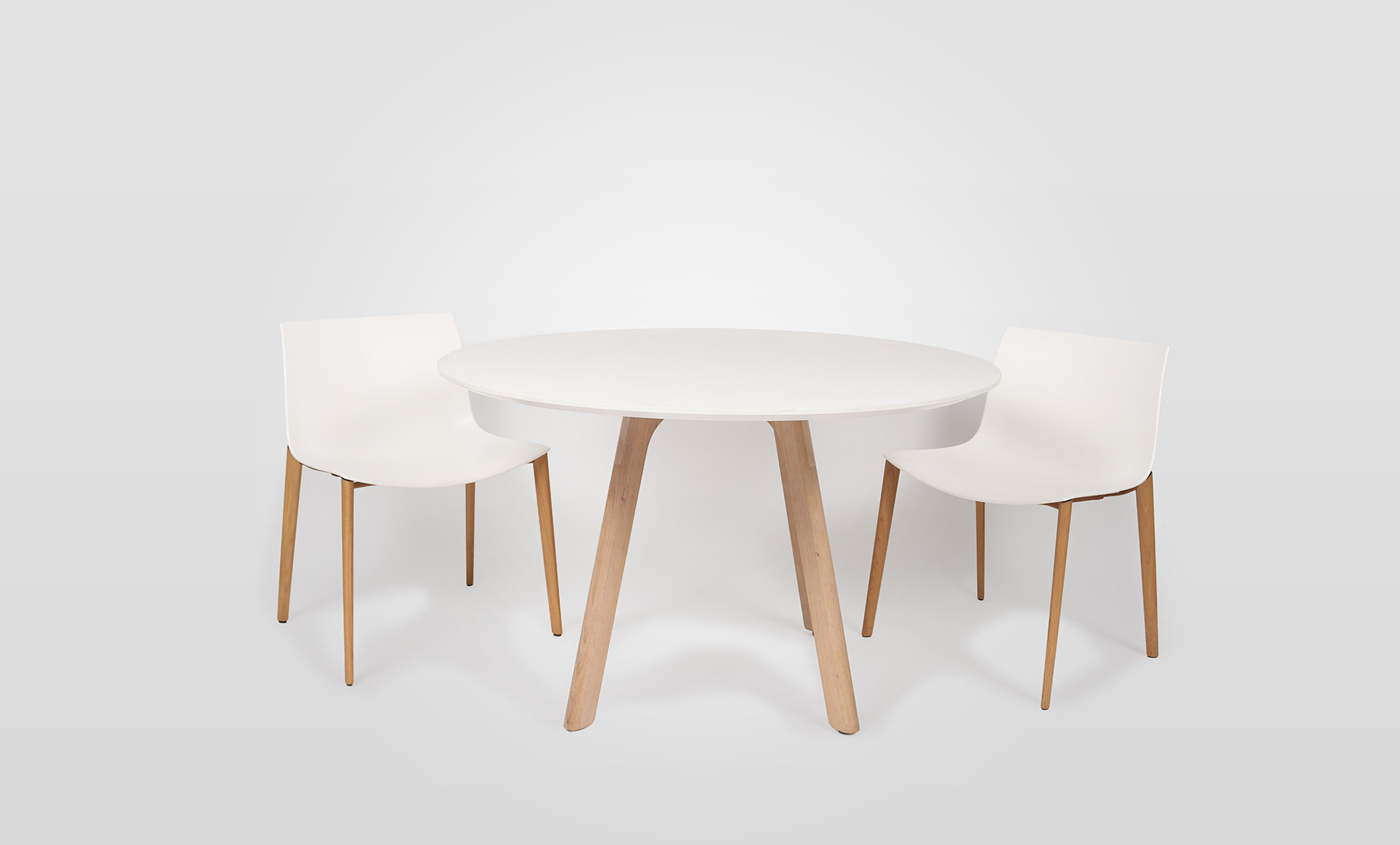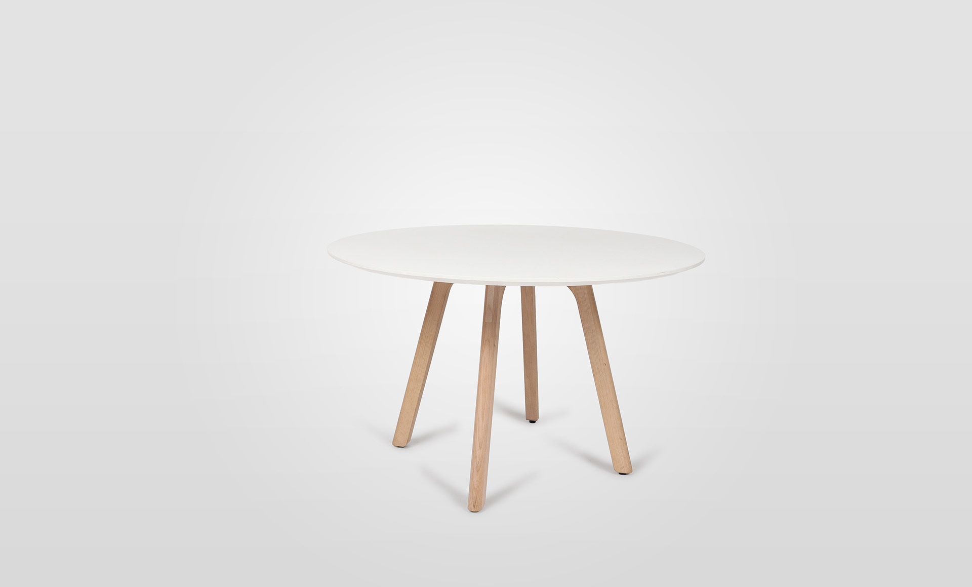 The Thinking Quietly 4 Leg Table by Thinking Works presents a refined and understated aesthetic, balancing geometric clarity with soft detailing. Its circular form and slim profile create a calm visual presence, ideal for contemporary interiors. Crafted with a 25mm Laminex Absolute Matte White tabletop, the surface features a sharknose underbevel edge for a clean, tactile finish. A matching ABS edge enhances durability while maintaining a seamless look. The solid oak four leg base, finished in a natural stain.