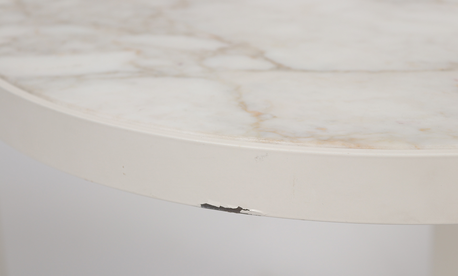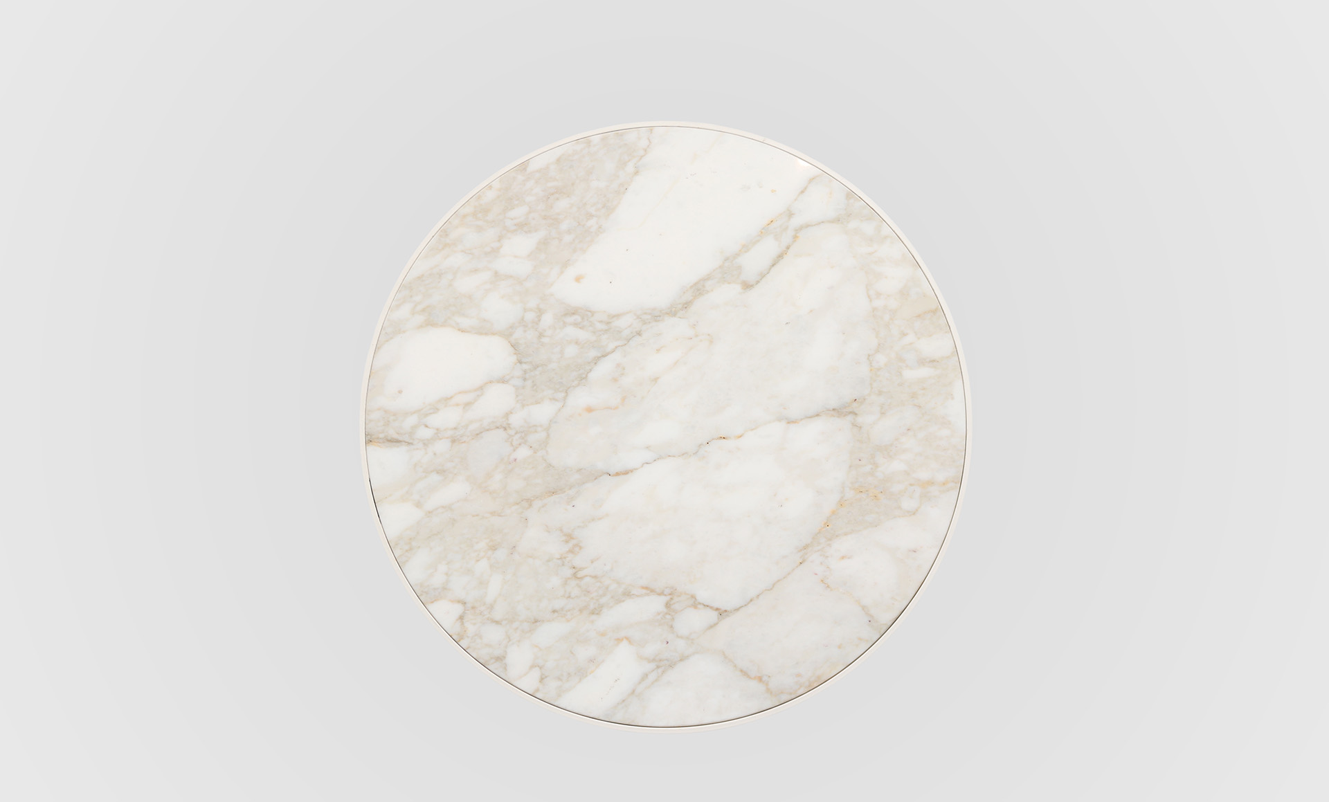 SAMPLE – Cage coffee table, 500mm dia x 470mmH, featuring inlaid White Calacatta marble top, on a PC mild steel table base featuring radius corner to CALACATTA MARBLE/WHITE PC FRAME.